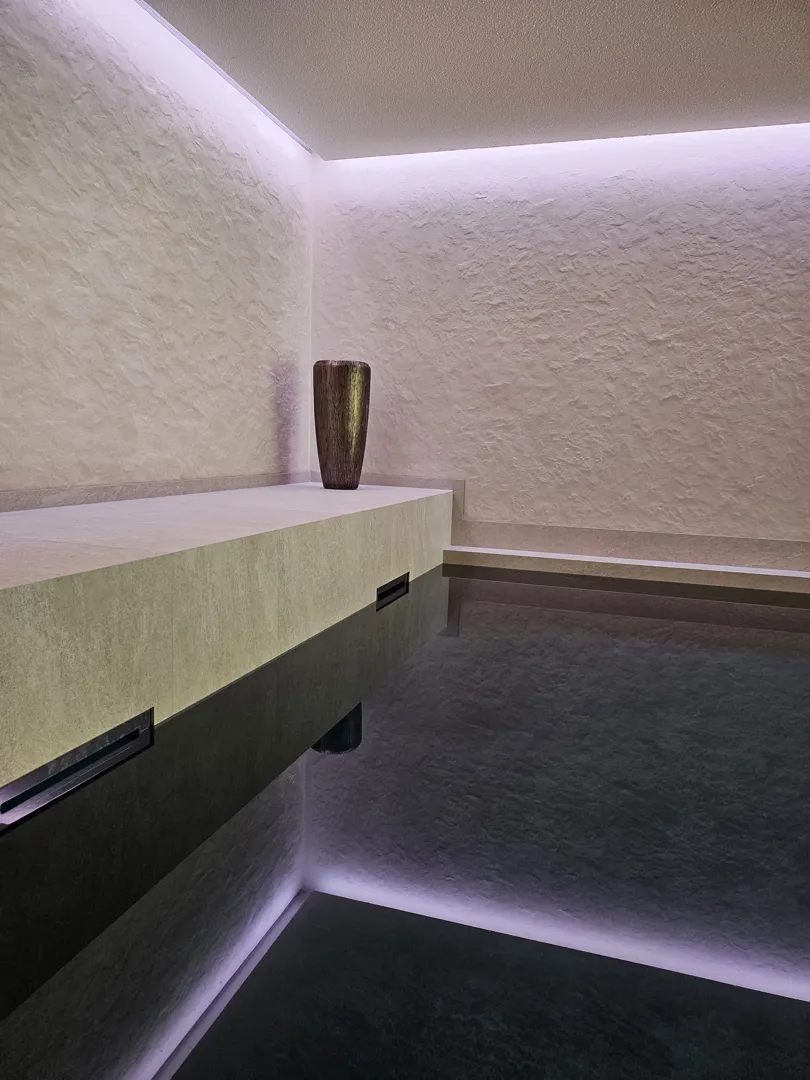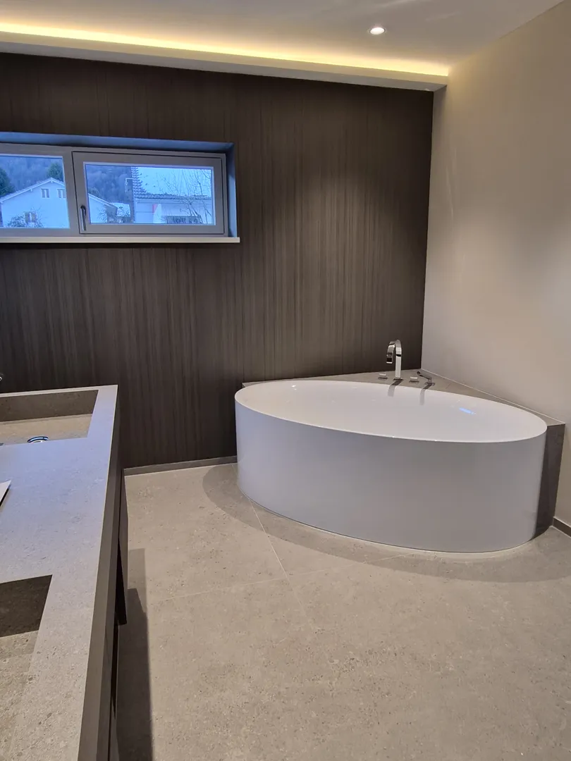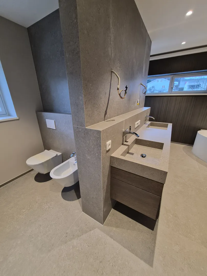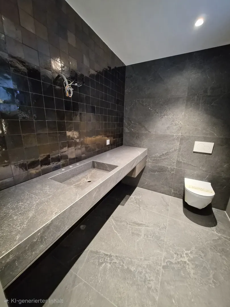 Badezimmer mit Wanne, Dusche und WC bis 2,4m WC bis 1,2m Waschraum nur am Boden + eine Duschniesche bis 2,4m Vorraum und Technikraum nur Boden Fläche gesamt: ca. 85m² Untergrund: Estrich, Beton, Ziegel und Trockenbau Fliesengröße: 60xcm, ca. 15m2 30x60 Fliesenart: Sichenia 94_Evo Feinsteinzeug