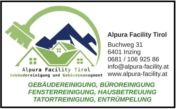 Über uns: Alpura Facility Tirol e.U – Ihr Partner für nachhaltige Gebäudereinigung & modernes Facilitymanagement. „Sauberkeit mit Präzision, Service mit Vertrauen“ Als Tiroler Familienbetrieb mit Sitz in Inzing stehen wir für Qualität, Verlässlichkeit und ein respektvolles Miteinander • Gebäudereinigung & Büroreinigung • Hausbetreuung & Objektpflege • Verkehrsflächenreinigung • Winterdienst & Schneeräumung • Grünraumpflege & Gartenservice • Tatortreinigung & Entrümpelung