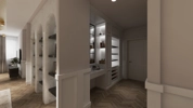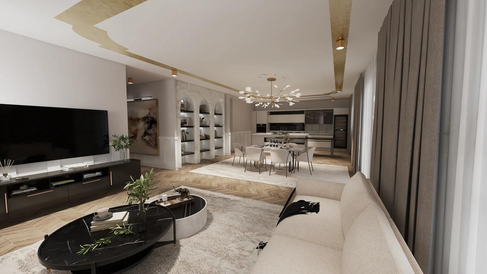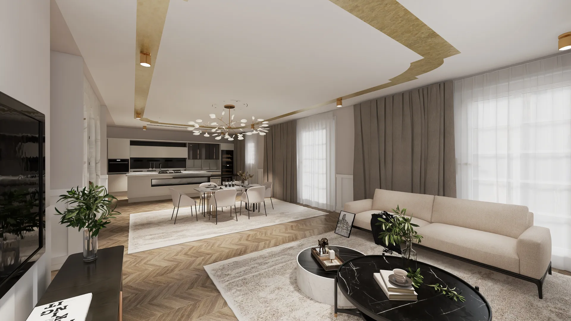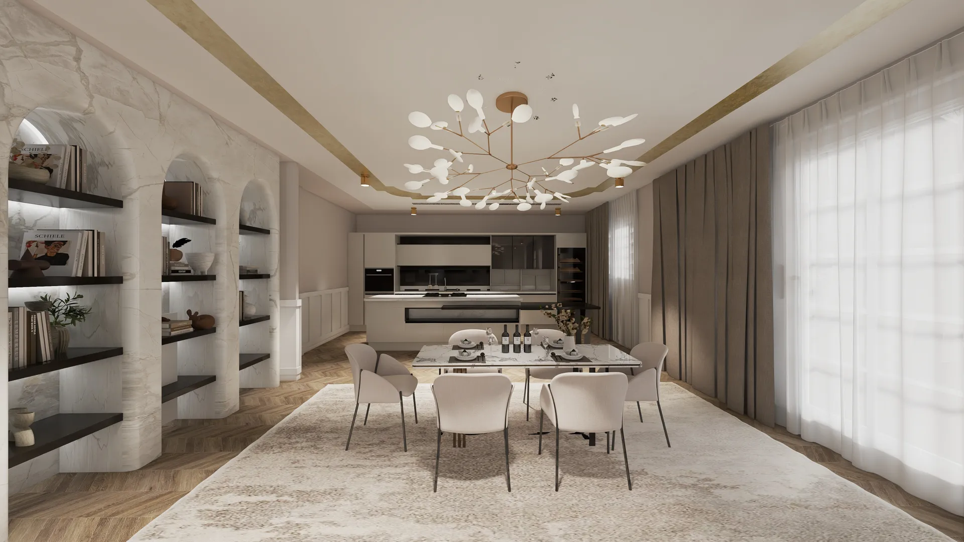 Wohn-, Essbereich Küche mit Kochinsel, auf der Insel soll Waschbecken, Cooker ganz wichtig, und Ceranfeld sein Durchreiche zum Poolbereich, bei der Wand Küchenzeile mit Hochschränken, Geschirrspüler, Kühlschrank, bis oben komplett verbaut, Esstisch in der Mitte vom Raum mit Platz für 8-10 Personen Parkettboden Eiche Alles mediterran-modern