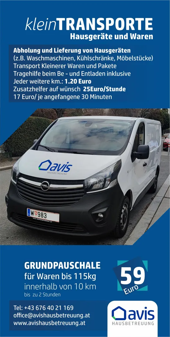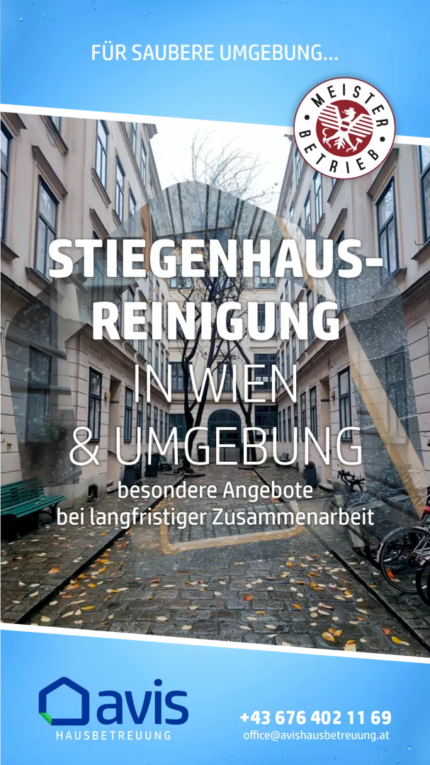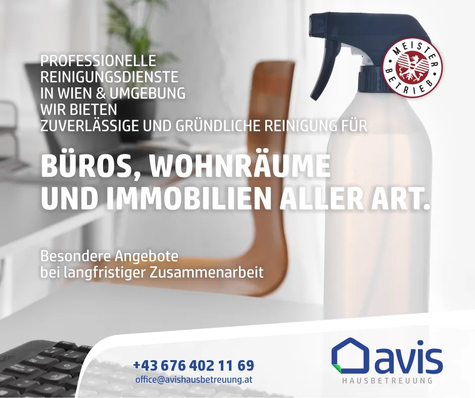 Über uns: Wir sorgen dafür, dass Ihre Räume nicht nur sauber, sondern auch spürbar angenehmer werden – ob Zuhause im Büro - Praxis größere Gewerbe. Unsere Leistungen: Büro- Praxisreinigung Stiegenhausreinigung Fensterreinigung Wohnraumreinigung – einmalig oder regelmäßig Grundreinigung- alle Bodenarten Ob laufende Betreuung oder kurzfristiger Einsatz – wir sind flexibel, gründlich und zuverlässig. Kontaktieren Sie uns – wir freuen uns auf Ihre Anfrage! Mit freundlichen Grüßen Avis Hausbetreuung