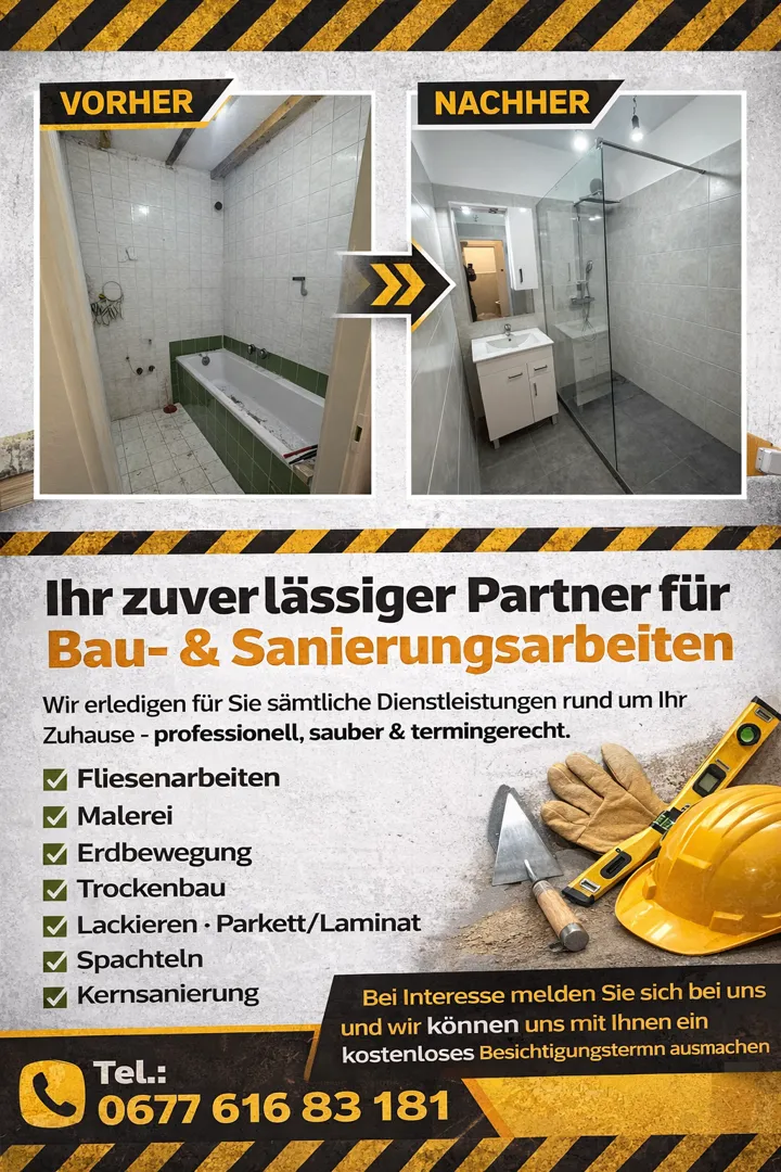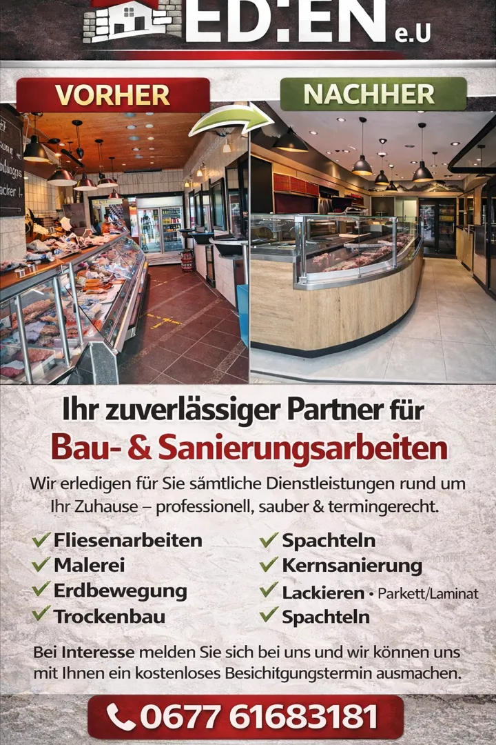 Über uns: ED:EN e.U – Ihr Partner für perfektes Wohnen Ob Fliesenarbeit, Badsanierung, Malerei oder Trockenbau – wir bringen Qualität, Präzision und Stil in Ihr Zuhause. Zuverlässig, sauber und termingerecht verwandeln wir Ihre Räume in echte Wohlfühlorte. ED:EN e.U – Handwerk, das man sieht und spürt.