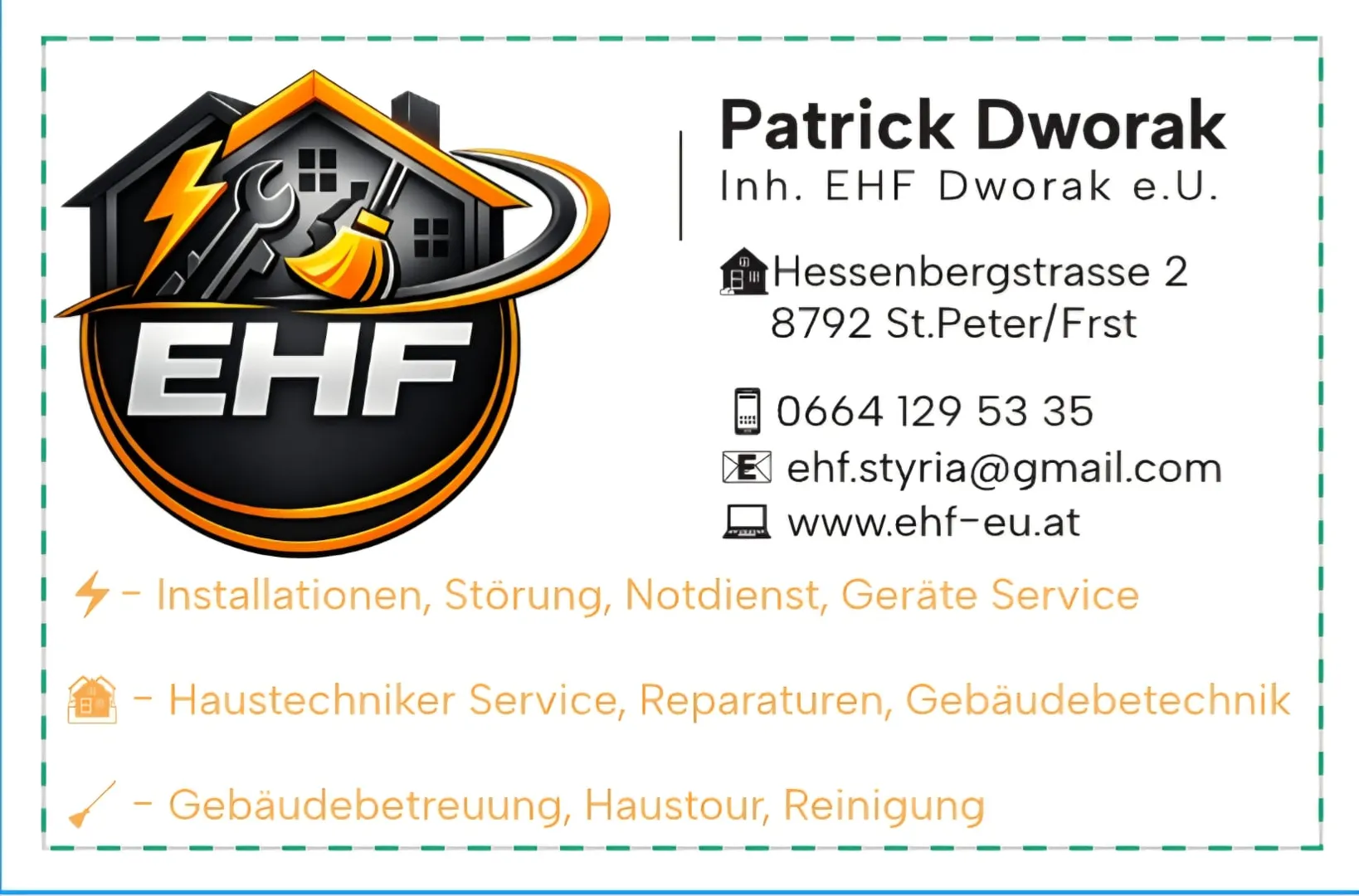 Über uns: Fa. EHF Dworak e.U. Elektrotechnik, Haustechnik und Gebäudebetreuung, alles aus einer Hand. Wir machen reparaturen, Störungsdienst und Notdienst für Elektrotechnische anliegen. Kleine reparaturen an Gebäuden sowie Haustechniker/Hausmeister tätigkeiten. Kleine Reinigungen sowie Haustouren, Wohnungsreinigung und Baustellenreinigung steht bei uns am Programm. Anfällige Arbeiten die bei Installationen anfallen, werden gern auch mitgemacht.