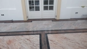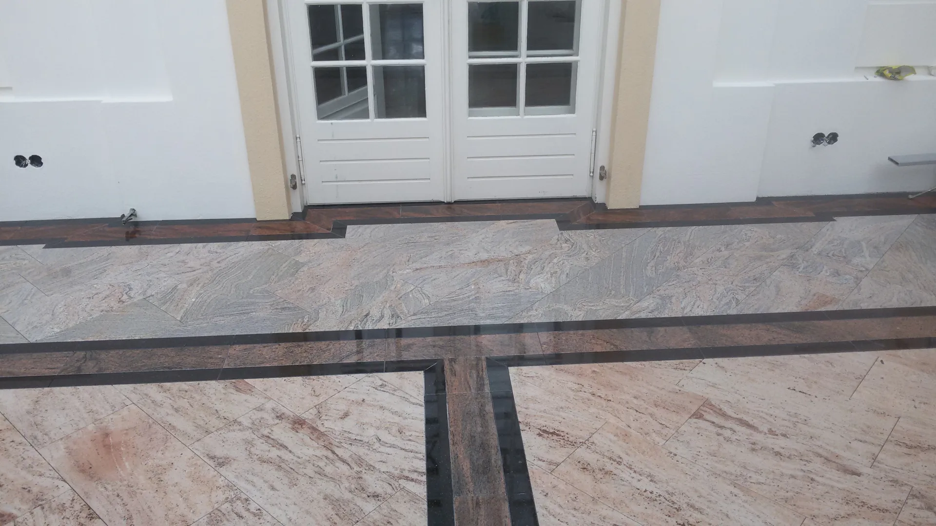 Verlegung im Dünnbett Fugenfarbe Bahamabeige Boden- und Wandliesen: Canova Limestone Projektort Liefering/Salzburg /cm 12,00m2 Bodenfliesen 31,50m2 Wandfliesen 7.50lfm Sockel aus Canova Limestone 6,00lfm Winkelschienen Alu eloxiert 1Pa Gefällekeilprofil links