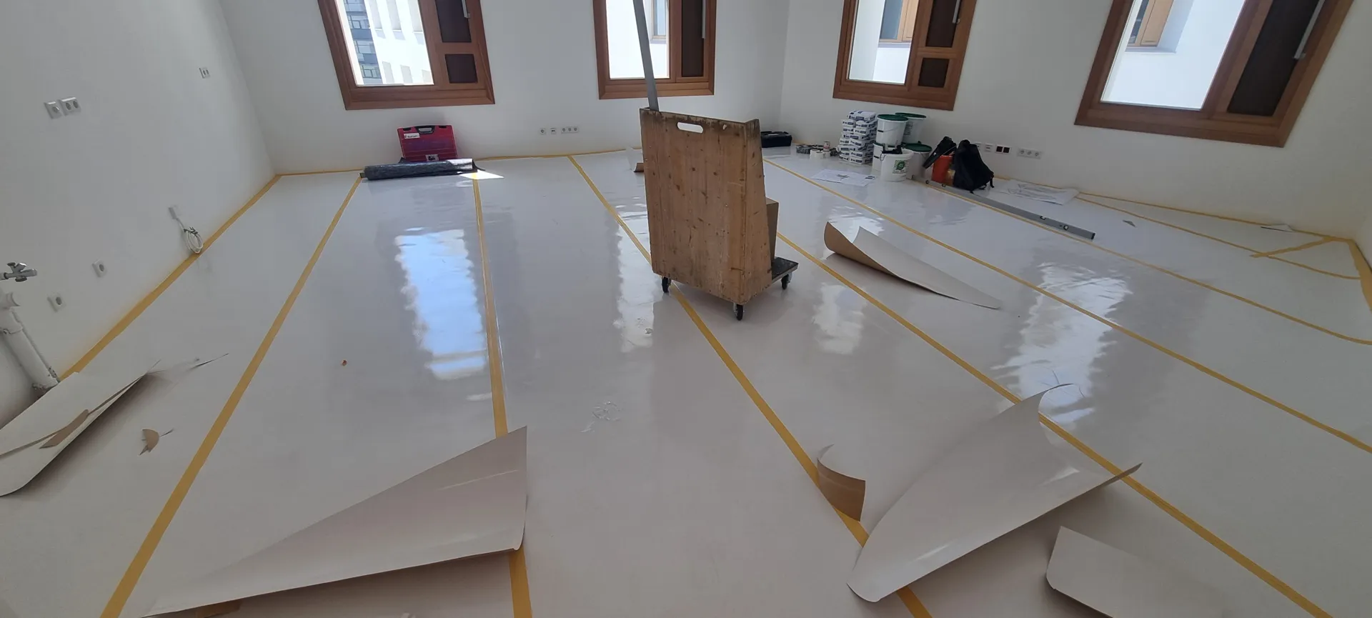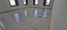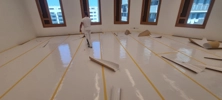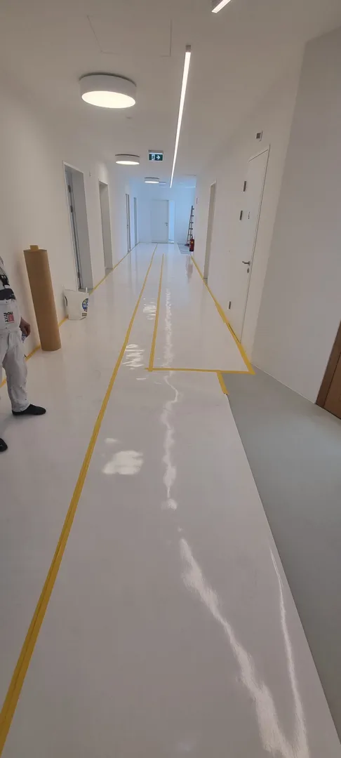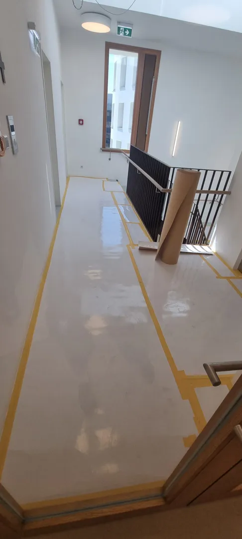 Bodenausgleich – Fließestrich Leistung: Auftrag von Fließestrich zur Ausgleichung von Unebenheiten auf der vorhandenen Betonplatte im Wohnbereich. Fläche: ca. m² Schichtdicke: bis ca. 2–3 cm, punktuell angepasst an vorhandene Vertiefungen. Ausführung: Haftbrücke / Primer: Auftragen nach Herstellerangaben. Estrichauftrag: Fließestrich anmischen und auf die vorbereitete Fläche aufbringen. Nivellierung: Mit Reibebrett, Richtlatte oder Laser nivellieren, sodass eine glatte, plane Oberfläche entsteht. Fertigstellung: Estrichoberfläche belagsfertig für die spätere Dämmung und Fußbodenheizung.