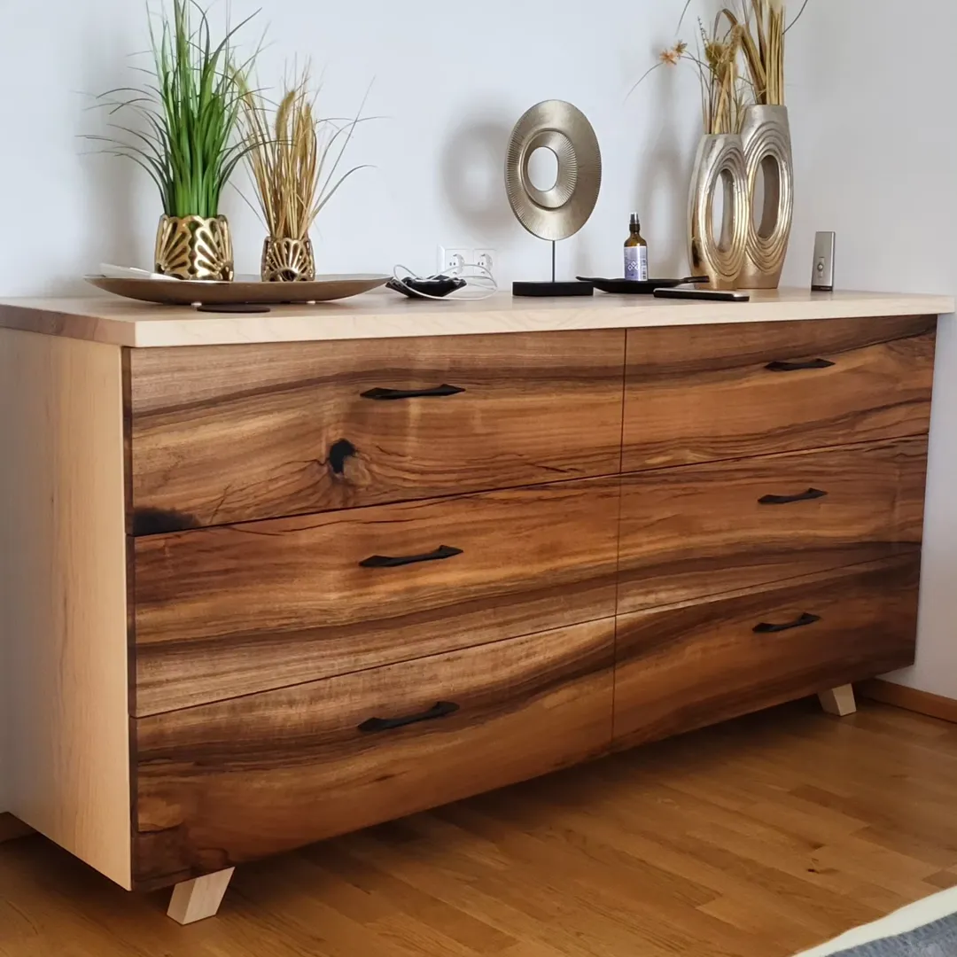 Kommode Mid century design. Holzart: außen Eiche oder anderes helles Holz, innen billigeres Holz (zb Fichte), aber überall Vollholz. Maße: Höhe: 90cm, Breite: cm, Tiefe: 70cm. Design ähnlich wie im Anhang, nur statt den schmalen Laden vier durchgängige, breite Laden übereinander.