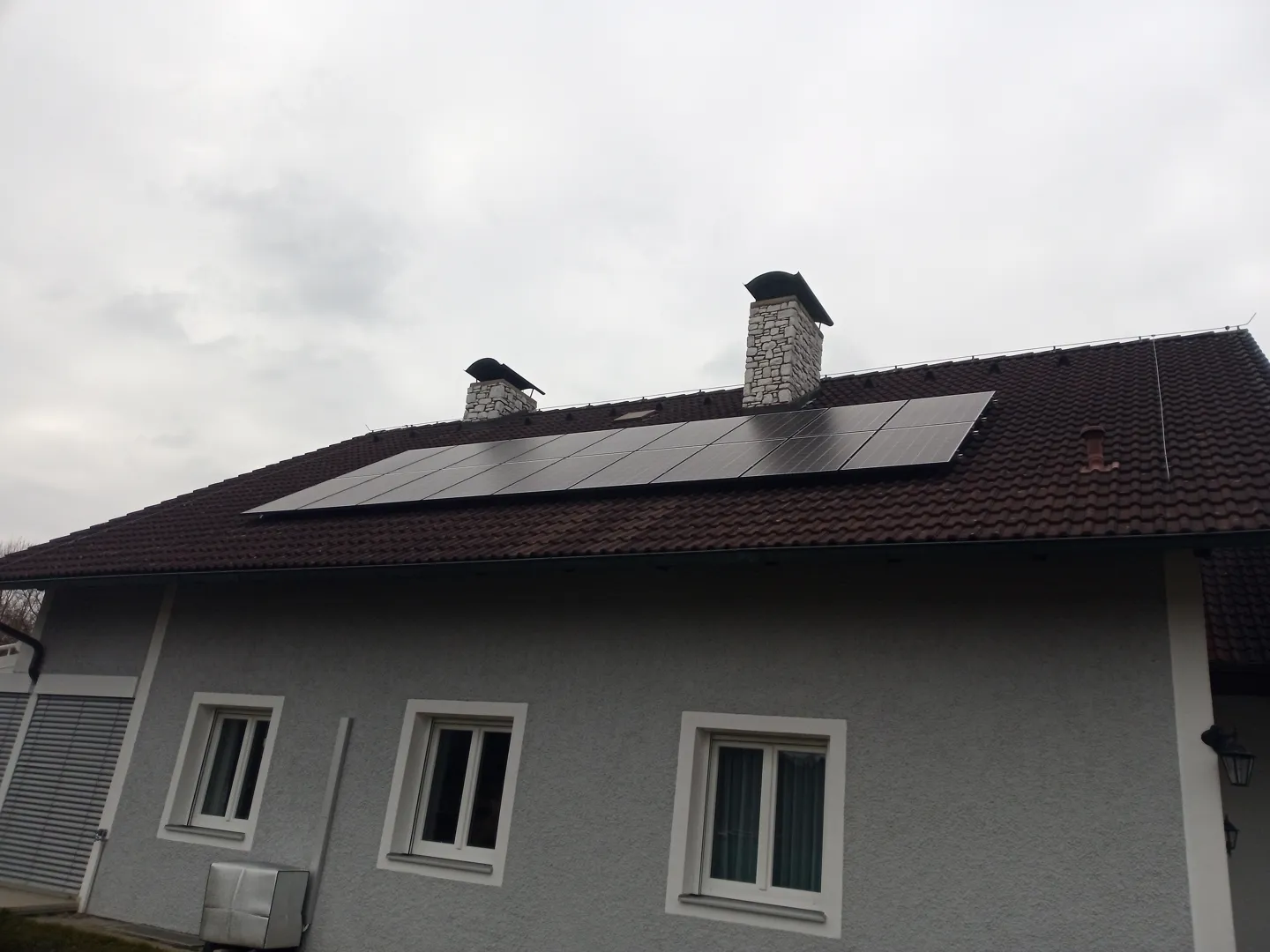 23 Paneele a W (10,5 kW), Walmdach 20 Grad, Montage auf Süd-, Ost- und Westseite (= 3 Strings), Setzung von Dachhaken, Schlitzen der Dachziegel (Bramac Classic), Anschluss PV-Paneele und Einfuhr in Dachboden, gesamtes Material (inkl. Dachhaken und Schrauben) ist vorhanden, Gerüst steht noch für zirka 2 Wochen