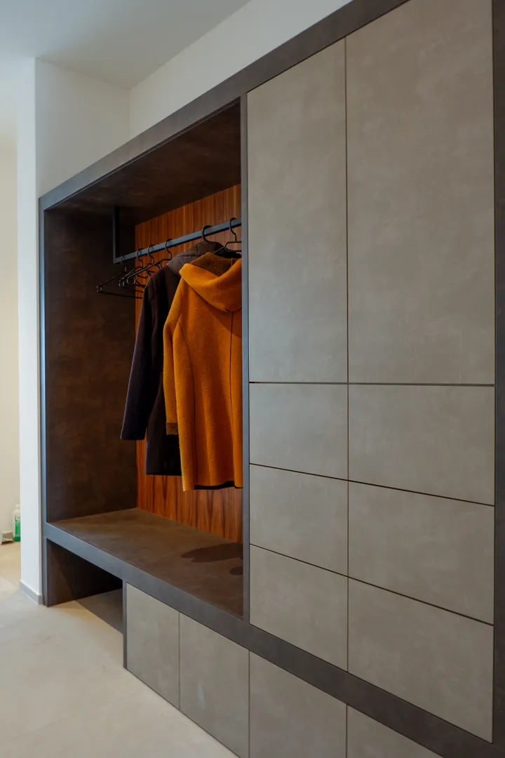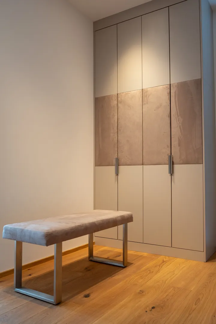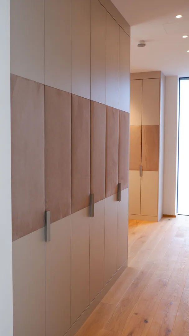 Ich hätte gerne zwei Einbauschränke (eingepasst in Wandnischen) Nr 1.: Schlafzimmer. Helle Farbe (weiß, creme) mit raumhohen Türen. Tap on wenn machbar. Alle Türen sollen gleich breit sein. Breite cm, Tiefe 64 cm, Raumhöhe cm. Aufteilung: 2 Abteile mit je einer Kleiderstange. Unter der Kleiderstange hätte ich gerne je 3 ausziehbare Schubladen, über der Kleiderstange Einlegeböden. Das dritte, schmalere Abteil für mit nur Einlegeböden (verstellbar). Nr 2: Breite cm, Tiefe 62 cm. Raumhöhe cm. Mit Kleiderstange und auch Einlegeböden. Zum Material: Kein Vollholz. Danke!